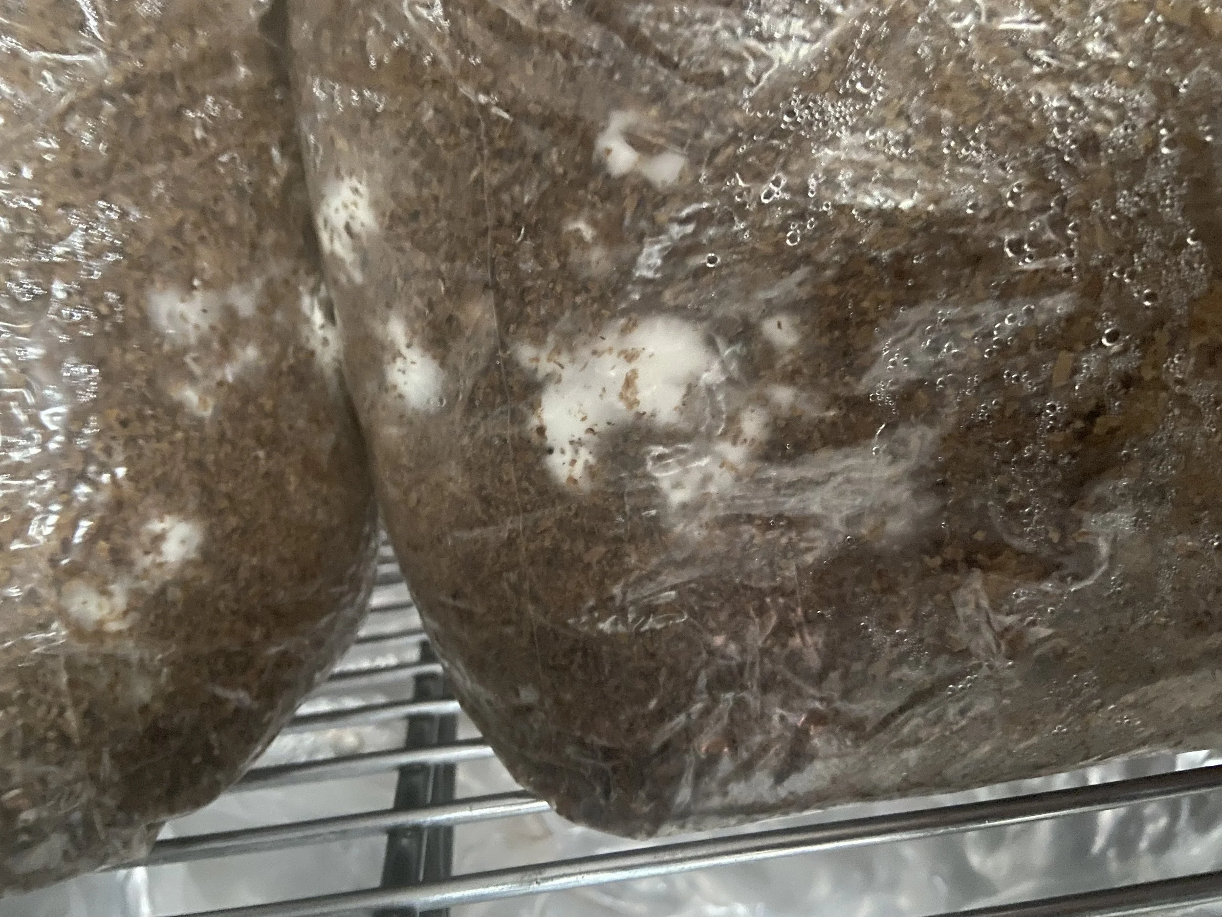 This image shows a partially colonized bag of mushroom substrate. The substrate is contained in a clear plastic bag, with visible white patches of mycelium beginning to spread but not yet covering the entire surface. Some areas remain uncolonized, showing the original color and texture of the substrate—often a light brown or tan. The mycelium growth appears healthy but incomplete, indicating that the bag is still in the colonization phase and not yet ready to be cut open or exposed to fresh air. —————>